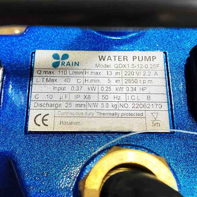 کفکش راین 12 متری 1 اینچ فلوتردار مدل QDX1.5-12-0.25F مناسب برای چاه های تا 14 متر که قطر لوله آن 1 اینچ باشد . موتور آن 0.34 HP و سیم پیچی مسی استفاده شده است سرعت 2850 دور ، این کالا جهت استفاده در آبیاری درختان و تخلیه آب چاه و استخر در همه مکان ها می باشد این کاملا ضد آب و نفوذ آب می باشد . این کالا تک فاز و 220 ولت 2 آمپر می باشد .