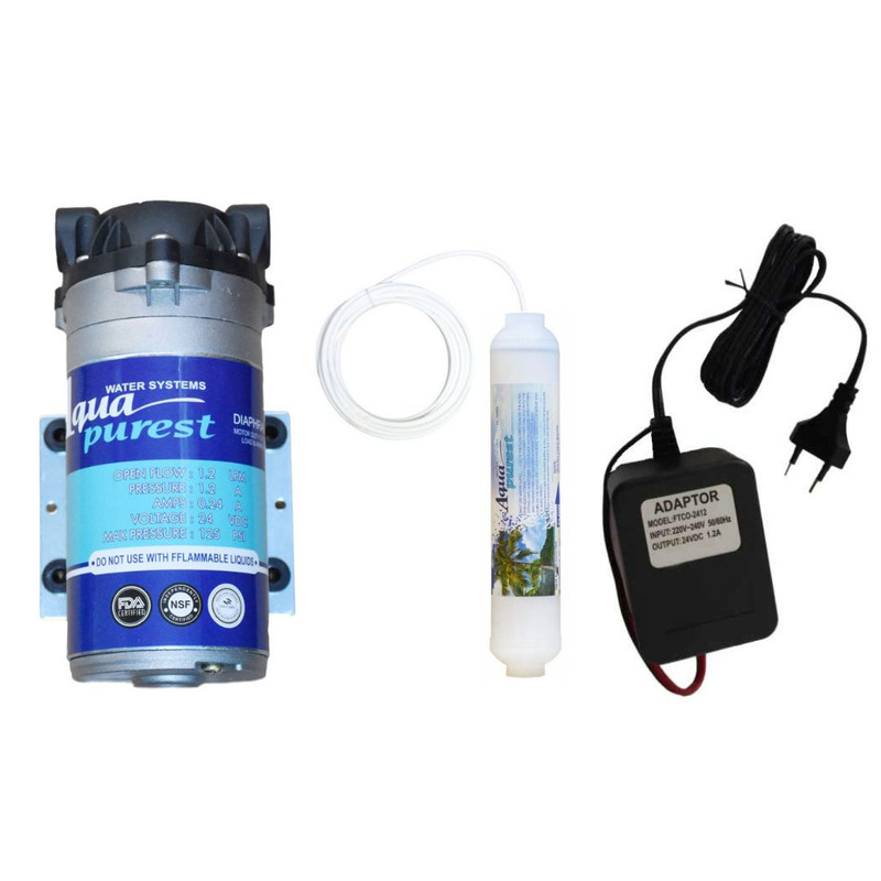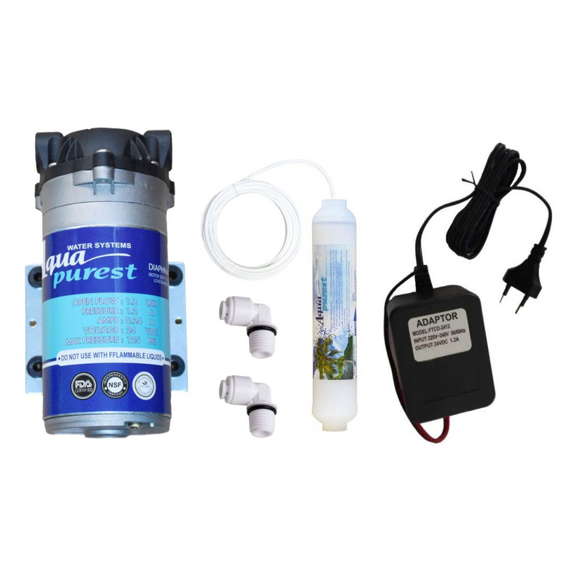پمپ مه پاش به همراه 2 عدد اتصال زانویی و آداپتور 24 ولت و فیلتر تصفیه کننده آب الیافی با برند معتبر آکواپیورست مدل 125psi از کاملترین و بروزترین تکنولوژی روز دنیا در ساخت پمپهای تحت فشار برخوردار است. کیفیت بالای ساخت، کارکرد بیصدا و بدون لرزش، طول عمر بالا و جریان خروجی ثابت و پایدار آب از ویژگیهای منحصر به فرد پمپ آب آکواپیورست میباشد. فیلتر تصفیه آب آکواپیورست قبل از ورودی آب به پمپ بین شلنگ توسط دو عدد اتصال خودکار فشاری (فیتینگ) که همراه فیلتر ارسال میشود قابل نصب است. این فیلتر قابلیت حذف ذرات معلق، گل و لای، شن و ماسه، جرم و رسوبات را دارد. با وجود فیلتر قبل از پمپ راندمان بالا میرود و عمر پمپ و نازل های مه پاش افزایش میابد. بهرهگیری کمپانی آکواپیورست (Aqua purest) از تکنولوژی روز دنیا برای ساخت قطعات و پمپهای تحت فشار با کیفیت موجب شده تا استاندارد ها و تائیدیههای جهانی همچون FDA, NSF, Water Quality را در کارنامه خود داشته باشد. کارکرد پمپ آکوا پیورست بسیار کم مصرف می باشد طوری که حدودا 1 آمپر از آداپتور برق دریافت میکند. جهت صحولت نصب و راه اندازی سیستم مه پاش اتصالات پمپ همراه کالا ارسال خواهد شد که شلنگ ساز 6 به این اتصالات نصب میشود. سطح کیفی پمپ تاثیر بسیار زیادی را در عملکرد و راندمان سیستم مه پاش دارد، به همین دلیل کیفیت پمپ تاثیر مستقیم در فرآیند پودر شدن خروجی نازل ها و عمل مه پاشی دارد. بنابر این اگر به دنبال خرید پمپ با کیفیت و مطمئن هستید، پمپ آکواپیورست یکی از گزینههایتان است.
