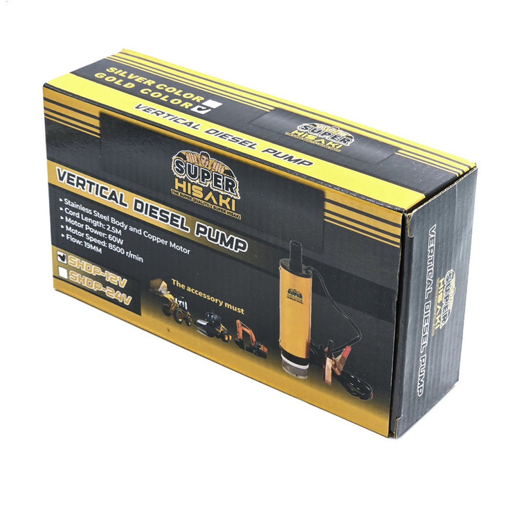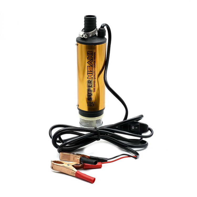 پمپ گازوئیل کش با برق 12 ولت (برق باطری خودرو ها) کار می کند. این پمپ میتواند از داخل مخزن یا باک ماشین آلات (بنزین ، گازوییل، روغن، کروزنو، پارافین، روغن هیدرولیک و سایر روغن ها ) سوخت کشی انجام دهد. این پمپ ها می توانند از ارتفاع 2.5 متری مکش کرده و با قدرت بسیار بالا تا 5 متر ارتفاع سوخت رسانی انجام دهد.از ویژگی های مهم این پمپ ها سرعت سوخت کشی است. در واقع به علت نیروی خوب موتور این پمپ ها، به راحتی می توان انتقال را انجام داد. در واقع به علت نیروی بالای موتور پمپ گازوئیل کش برقی ماشین آلات راهسازی، به راحتی می توان انتقال را انجام داد.پمپ تخلیه گازوئیل دارای انبرهای سوسماری شکل برای اتصال به برق باطری می باشد