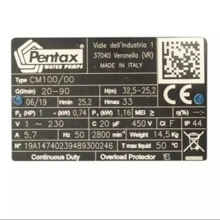 پمپ سانتریفوژ یک پروانه CM100 پنتاکس مناسب برای مصارف خانگی و ساختمان های با ارتفاع کم در دبی 40 لیتر بردقیقه پمپ CM100 پنتاکس 33 متر هد دارد به این منظور توانایی پمپاژ آب را تا طبقه پنجم یک ساختمان دارد نسبتا ماکزیمم دبی پمپ CM100 پنتاکس نیز بالاست (90 لیتر بردقیقه )، همچنین از پمپ CM100 پنتاکس می توانید برای مصارف ساده صنعتی نیزاستفاده کنید.