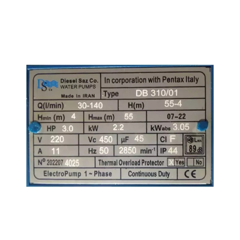 پمپ آب دیزل‌ساز مدل db310/01 سه اسب دو پروانه