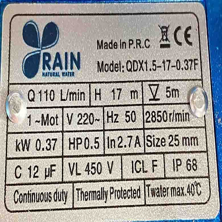 کفکش راین 17 متری 1 اینچ فلوتردار مدل QDX1.5-17-0.37F مناسب برای چاه های تا 17 متر که قطر لوله آن 1 اینچ باشد . موتور آن 0.5 HP و سیم پیچی مسی استفاده شده است سرعت 2850 دور ، این کالا جهت استفاده در آبیاری درختان و تخلیه آب چاه و استخر در همه مکان ها می باشد این کاملا ضد آب و نفوذ آب می باشد . این کالا تک فاز و 220 ولت 2 آمپر می باشد .