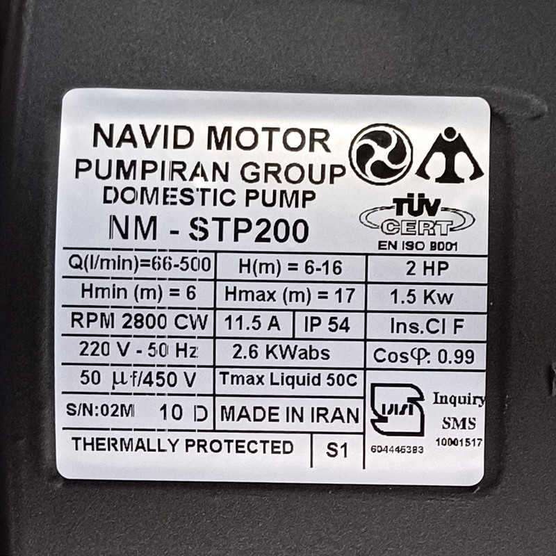 پمپ فیلتردار استخری نوید موتور NM-STP 200 ساخت شرکت نوید موتور می باشد. این شرکت از شرکت های زیرمجموعه صنایع پمپ سازی پمپیران در ایران بوده و از سال 1375 فعالیت خود را در زمینه تولید انواع الکتروموتورهای صنعتی و خانگی آغاز نموده است.